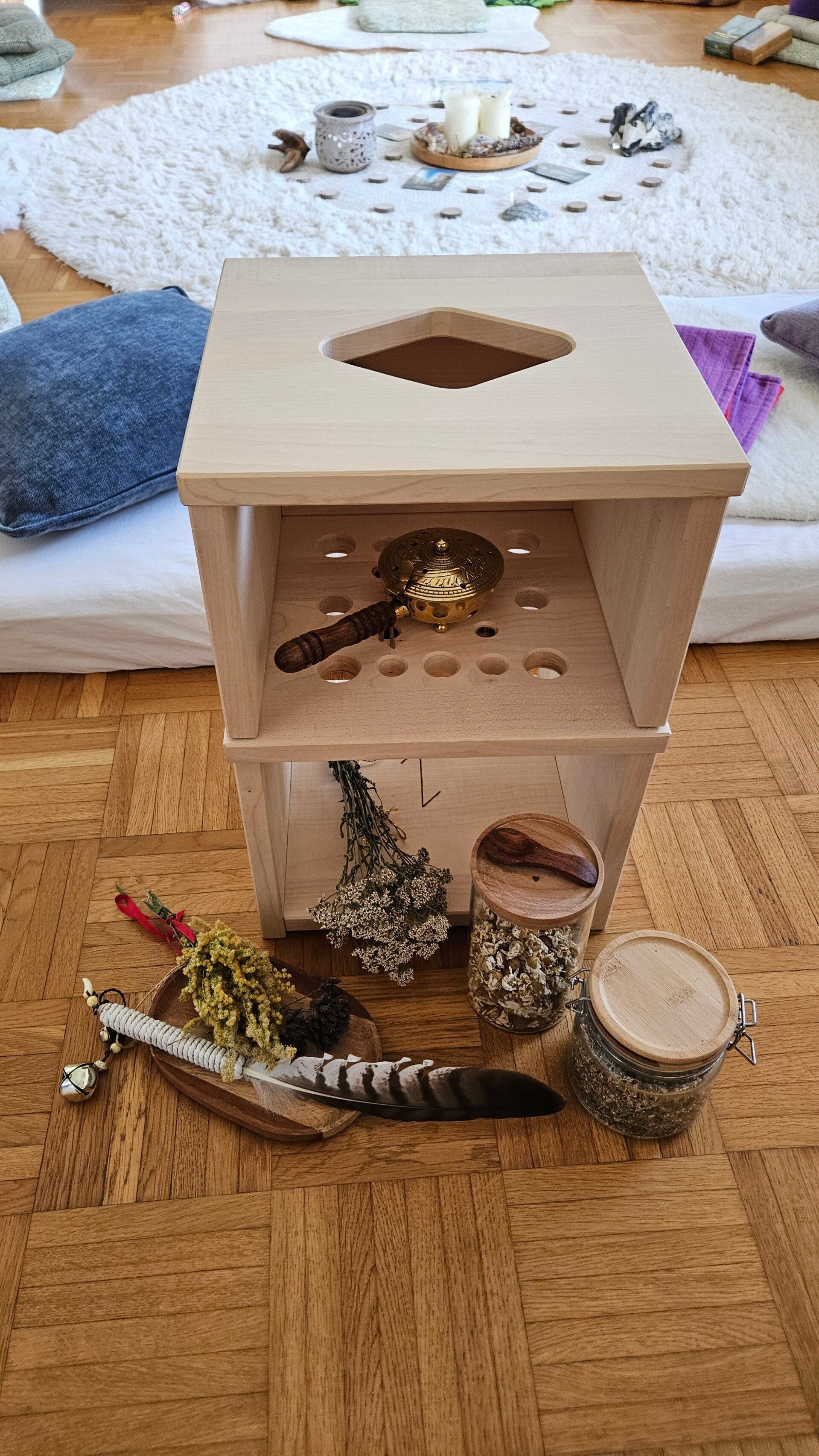 Anschließend bereite ich den Platz für dich vor und erkläre dir jeden Schritt, sodass du jederzeit orientiert bist. Es gibt keinen Moment, in dem du überrascht wirst. Das Ritual kann stehend über dem Dampf / Rauch stattfinden oder auf einem extra hierfür konzipierten Hocker im Sitzen.